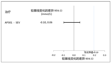 • At week 12, the least squares mean (LSM) reduction from baseline was 0.72 mmol/L (2.22 mg/dL) for AP301, compared to 0.70 mmol/L (2.17 mg/dL) for sevelamer carbonate. AP301 demonstrated non-inferiority to sevelamer carbonate, with an LSM difference of -0.02 mmol/L(95% confidence interval (CI): -0.10, 0.06)[-0.06 mg/dL (95% CI: -0.31, 0.20)]; the upper CI bound of 0.06 mmol/L (0.20 mg/dL) was below the pre-defined non-inferiority margin (NIM) of 0.19 mmol/L (0.59 mg/dL). (see Figure 1)