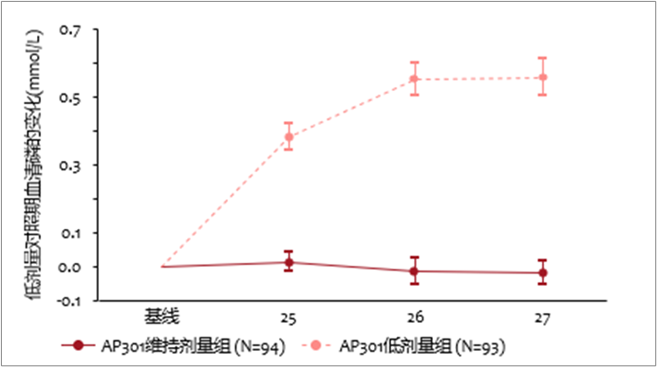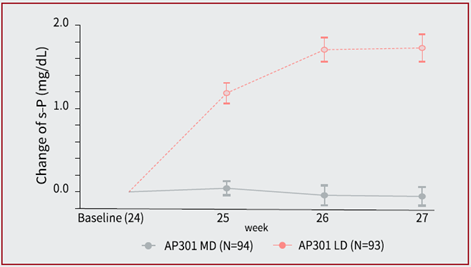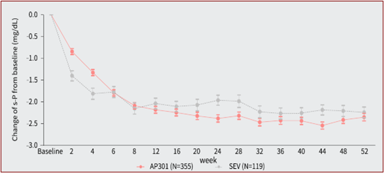 • At week 27, AP301 maintenance dose showed a clinically and statistically significant superiority on serum phosphate control over an ineffective AP301 low dose in the low dose control phase {LSM difference -0.58 mmol/L (95% CI: -0.69, -0.47; P <0.001) [-1.8 mg/dL (95% CI: –2.1, –1.5; P <0.001)]}. (see Figure 2)