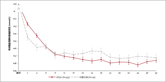 • 有效性:AP301 维持剂量在降低血清磷水平上,相较于无效低剂量具有临床及统计学上的显著优效性,且在整个 52 周的治疗期内,AP301 的疗效稳健且持久,达到试验设计的降低血清磷水平方面不劣于碳酸司维拉姆的终点。
